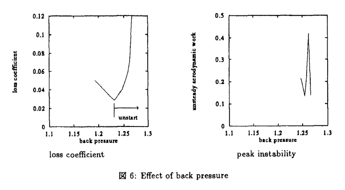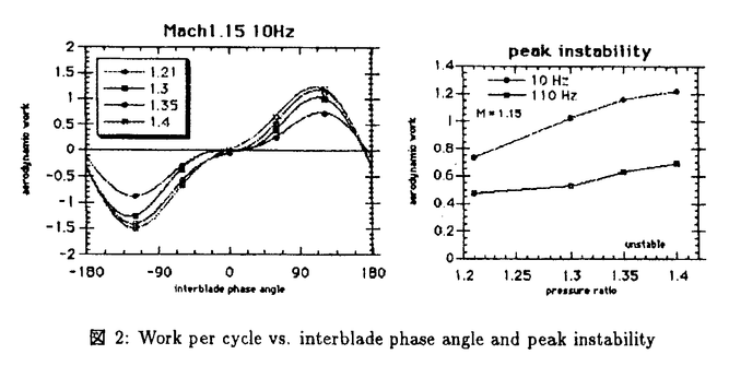 修士(工学)柴田貴範提出の論文は、「遷音速翼列フラッタに関する研究」と題し、7章から成っている。 近年、ジェットエンジンのファンや圧縮機の高負荷大容量化の要求にともない、大弦長、薄型、低キャンバー翼が多用されるようになっている。そのような翼列が部分負荷である遷音速状態で作動する場合、曲げモードの翼列フラッタが発生し、圧縮機性能を落とさずにいかにこのフラッタを回避するかが重要な課題となっている。 遷音速翼列フラッタにおいて、翼列内の衝撃波変動により生ずる非定常空気力が、翼振動の安定性を決める上で重要な役割を果たすことは、これまでに指摘されている。しかし、具体的にどのような流れ場でフラッタが発生するのか、あるいは、その主要な発生機構は何かについて、未解明な点が多いのが実情である。 本論文で著者は、翼列内に強い衝撃波を含む非定常流れ場を対象に、数値計算と風洞実験による解析を行い、翼列の曲げモードフラッタに関し、各種パラメタの変化に対する特性を明らかにするとともに、曲げモードフラッタの発生と衝撃波形状の関係を解明することに成功している。 第1章は「序論」であり、遷音速翼列フラッタに関するこれまでの研究を概観し、本論文の研究の背景と目的を明確にしている。 第2章の「風洞実験」では、実験設備や計測法について説明し、風洞実験によって得られた結果を考察している。実験には2次元直線翼列風洞を用い、影響係数法を利用した翼列振動の安定性解析を行っている。それにより、翼列前後の圧力比の増加は曲げフラッタの発生を助長すること、一方、振動周波数の増加はフラッタ発生を抑制する効果があること等を確認している。また、流入マッハ数を変化させた実験により、特定範囲の流入マッハ数において空力弾性的な不安定性が強まることを示し、境界層剥離などの強い粘性の効果はかえってフラッタを発生しにくくすることを示唆している。 第3章の「解析手法」では、オイラー方程式を時間進行法で直接解く非線形解析手法と、定常項に対し非定常擾乱項を線形化する線形解析手法について説明している。特に、線形オイラー方程式から得られる衝撃波の非定常空力仕事に関し、衝撃波の全非定常空力仕事は、衝撃波捕獲法あるいは衝撃波適合法などの衝撃波の取扱い方には依存しないことを明らかにしている。また、この種の非定常翼列計算で問題となる入口、出口境界での非定常擾乱の無反射条件についても言及している。 第4章の「解析手法検証」では、第3章で提示された解析手法の正当性を検証し、本研究の解析手法は、線形・非線形手法ともに精度の高い予測能力があることを確認している。また、衝撃波を含む流れ場における線形化の妥当性と、翼列共鳴現象による適用限界を検討している。 第5章は「遷音速振動翼列の基本特性」と題し、強い衝撃波を含む翼列の非定常空力特性の概要について、解析結果をもとに考察している。曲げモードの振動翼列安定性は、流れ場や翼間位相差、振動周波数に強く依存するだけでなく、並進振動の振動方向の影響を顕著に受けることを指摘している。即ち、曲げモードフラッタは、主として正の翼間位相差で発生すること、また、翼の振動方向が翼弦に垂直な方向から翼列方向寄りに変化するほどフラッタが起こりやすくなることを示した。また、衝撃波を含む流れ場の非線形性の立場から、空力仕事の振動振幅依存性に関しても調べている。結果的には、安定性が問題となる振動方向や翼間位相差における振幅依存性が小さいことから、微小振幅近似に基づく線形の安定性解析によって、フラッタ境界の適切な予測が可能であるとしている。 第6章の「考察」では、衝撃波形状と翼列振動の安定性との関係について考察している。それによると、過回転数領域で観察される曲げモードフラッタは翼後縁から強い衝撃波を発生するような流れ場と関連しており、一方、中間回転数のサージ線寄りで観察される曲げモードフラッタは翼列の不始動状態と関連している。そして、いずれの場合もフラッタ発生には衝撃波付着点の空力仕事が支配的な役割を果たすことが示されている。また、不始動状態のフラッタ発生には翼列の背圧が特に重要であり、わずかな背圧変化によって空力仕事が急激に変化する事実も明らかにしている。 第7章は「結論」で、各章で得られた結論をまとめている。 以上を要するに、本論文は遷音速翼列フラッタに関して、オイラー方程式に基づく数値解析と直線翼列を用いた風洞実験を行い、振動翼列における衝撃波の役割を明確化することを通じて、高負荷、中・高回転数領域における曲げモードの翼列フラッタ発生機構を解明したもので、航空宇宙工学上貢献するところが大きい。 よって、本論文は博士(工学)の学位請求論文として合格と認められる。 |