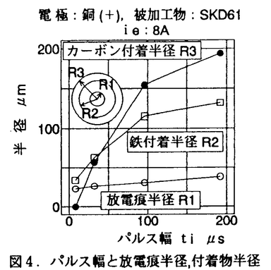 | 内容要旨 | | 近年,形彫放電加工はめざましい発展をとげ,新たな分野への応用が広がっている.例えば,複合構造体電極を用いた表面改質加工などがその一例として挙げられる.この表面改質加工では電極は非常に消耗する.また,特に高精度加工の場合には,消耗の激しい電極角部に注目する必要がある.このような形彫放電加工における新たな応用分野,およびより高精度な加工では,電極の消耗現象に対する旧来の考え方を再考する必要性が認識されてきている. 本論文は,形彫放電加工における高精度化の実現のために,電極消耗現象を電極消耗の時間依存性,および電極表面に付着するカーボンの効果から考察し,電極低消耗メカニズムを一層明確にすることを目的する. 1.電極消耗にともなう形状変化 加工中の電極形状の変化を評価するために,電極の平坦部(底面部)の消耗と電極角部の消耗を比較した.電極角部の消耗半径Rはその形状を計測することにより把握した.底面部の消耗長さ Xは電極消耗重量,および角部消耗半径Rより計算により求めた. 図1に電極角部消耗半径Rと電極底面部の消耗長さ Xの時間的推移を示す.加工進行後では,角部消耗半径は消耗長さの約10倍であるのに対して,加工初期段階では数百倍となっていることが確認できる. 電極角部の消耗率は計測した角部消耗半径Rを用いて計算により求めた.図2のグラフAは電極角部の消耗率の時間的推移を示し,グラフBは全体の消耗率の時間的推移を示す.ここで,全体の消耗率は角部と底面部の消耗率の和である.図2から加工初期段階では全体の消耗率は非常に小さく,その後,電極や加工物の材料,および加工条件で決まる消耗率に漸近していくことが分かる.加工開始後の10分間では,角部消耗率が全体消耗率より大きい.このことは,加工初期段階では電極平坦部(底面部)が盛り上っていて,負の消耗になっていることを意味している.電極底面部にはカーボンの付着が観察されることから,この盛り上りは加工油の分解カーボンの付着によるものと想像される. 図表図1.電極消耗長さと電極角部消耗半径の時間推移 / 図2.消耗率の時間推移 一方,角部消耗半径は加工初期段階で既に非常に大きくなっている.加工初期段階では,電極角部にはカーボンの付着は非常に少ない.加工進行後では,角部にもカーボン付着が観察され,この段階では,角部の顕著な消耗は観察されない.以上より,電極角部と電極底面部とでは,その消耗が全く異なった推移を示すことが明確となった. 2.電極表面に付着したカーボンの効果 電極低消耗の要因の一つとして,電極表面への付着カーボンが重要であると言われている,しかし,詳細には検討されていない.そこで,この付着カーボンの構造,および付着量と電極消耗の関連を詳細に検討した. 炭素鋼の加工における銅電極の消耗率は,黄銅,亜鉛合金(ZAS)または銅を加工した場合の消耗率より小さい.炭素鋼を加工した場合には,電極表面のカーボンは非常に強固に付着している.その他の場合では,電極表面への付着カーボンは簡単にふき取ることができる.X線回折による分析では,電極表面に強固に付着したカーボンは乱層構造カーボンであることが明らかとなった.この乱層構造カーボンは,炭素の6角網平面の一層一層がグラファイト構造のように規則正しく積み重なっているのではなく,無秩序に積み重なった積層構造をなしている. 以上より,電極表面への乱層構造カーボンの付着は被加工物材質に依存することが予想される.また,この付着が電極の消耗を防ぐと考えられる. 銅電極の消耗に対する被加工物材質の影響を確認するために,各種の材料を被加工物として放電加工を行い,電極加工面をX線回折により分析した.回折X線ピーク強度は,その物質の量に依存する.したがって,乱層構造カーボンの付着量を回折X線のピーク強度により評価した.図3は電極消耗速度とピーク強度との関係を示す.電極消耗速度は回折X線ピーク強度,つまり乱層構造カーボンの付着量に依存していることが分かる.また,このピーク強度は被加工物材料により異なることが分かる. 図3.電極消耗速度と乱層構造カーボンによる回折X線ピーク強度の関係 この乱層構造カーボンの生成付着は,被加工物材質のグラファイト生成に対する触媒作用から理解できた.鉄,ニッケル,クロムは触媒物質である. また,電極消耗はパルス幅の増加に伴って減少することが知られている.これはパルス幅の増大に伴う放電点の電流密度(放電痕電流密度)の低下によって説明されてきた.しかし,鋼を加工した場合には,パルス幅の増大に伴って乱層構造カーボンの生成量が多くなることを,連続放電加工を行った電極面のX線回折分析によって確認した. カーボン付着量に対するパルス幅の影響を確認するために,鋼に対して単発放電を行い,銅電極側の単発放電痕を観察した.図4に放電痕の半径R1,鉄の付着半径R2,およびカーボンの付着半径R3とパルス幅との関係を示す.R1,R2,およびR3の各々がパルス幅の増大と共に増加している.しかも,R1の増加に対してR2とR3の増加が